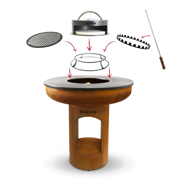 De BonBiza XL is eenvoudig uit te breiden met diverse accessoires, zoals een extra grillrooster, pizza-oven of een spiezenring voor het bereiden van allerlei gerechten. Hiervoor is de BonFeu standaard 120 cm noodzakelijk. Begin met het plaatsen van deze standaard en stapel daarna de onderdelen voor je perfecte buitenkeuken.