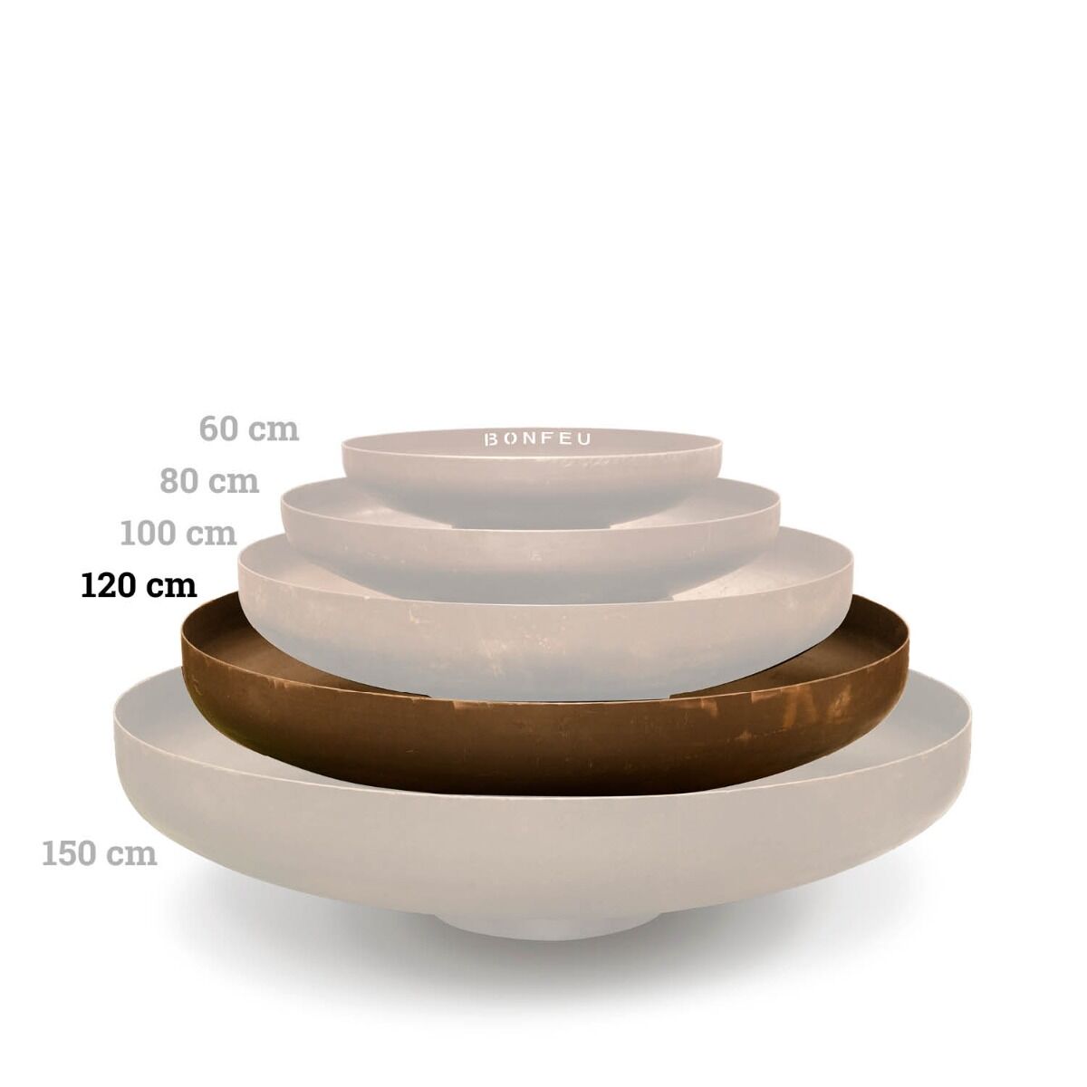 -Robuuste vuurschaal met een diameter van 120 cm, vervaardigd uit 3 mm dik Cortenstaal.