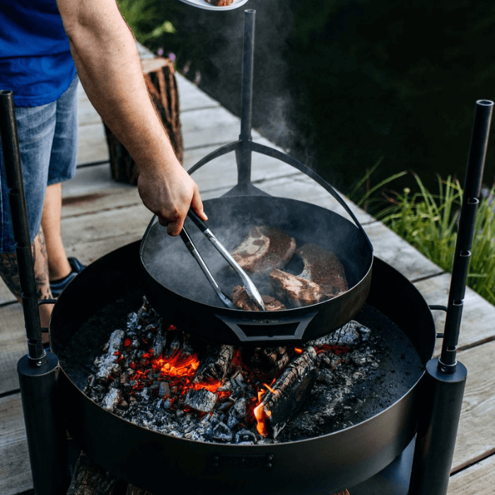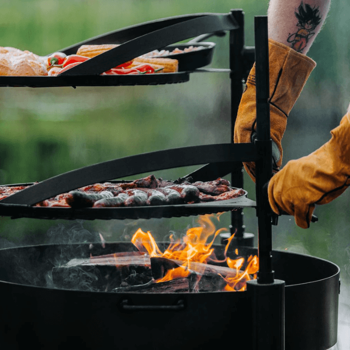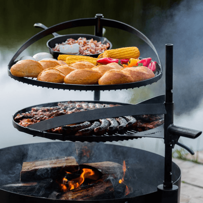 Wil je meerdere gerechten tegelijk bereiden? Gebruik dan meerdere masten tegelijk – bijvoorbeeld één met een grillrooster, één met een bakplaat en één met een pan. Zo bereid je moeiteloos een complete maaltijd. De bakplaat is ideaal voor vlees, vis, kip of bijgerechten zoals aardappeltjes of champignons. Het grillrooster geeft je ingrediënten die authentieke rokerige barbecuesmaak – perfect voor stevige groenten of mooie stukken vlees.