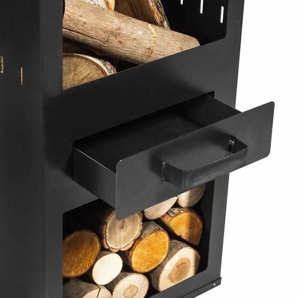 De houtopslag onderin is een open vak waar je het hout kunt stapelen. Zo blijft het hout droog en brandt het altijd goed. Omdat de tuinhaard helemaal over de houtopslag valt, wordt het hout beschermd tegen regen. Tijdens erg natte dagen is het echter aan te raden om het hout binnen of in een schuur te bewaren voor extra droogte.