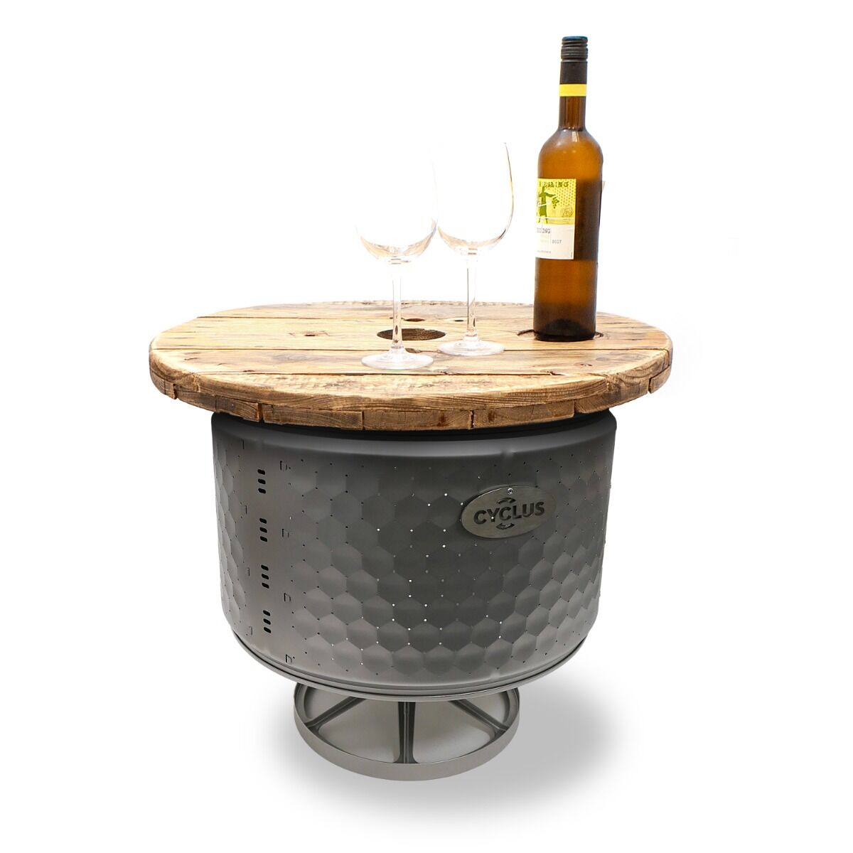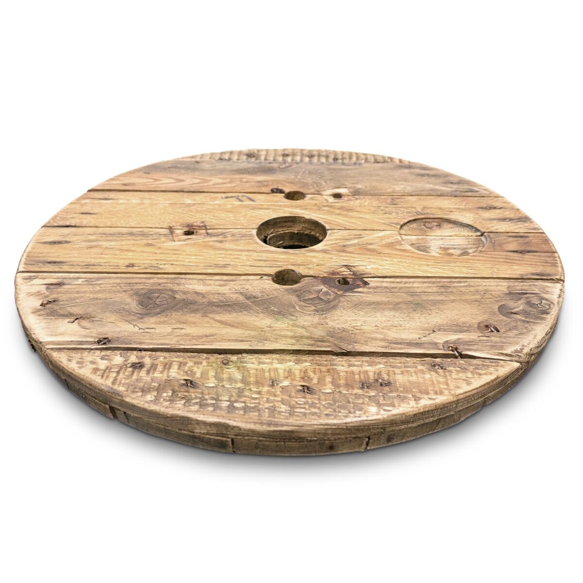 Het tafelblad is volledig vervaardigd uit de zijkant van een oude hardhouten haspel. Deze haspel is zorgvuldig uit elkaar gehaald, waarna de houten delen zijn hergebruikt. Het resultaat is een tafelblad dat niet alleen 100% gerecycled is, maar ook een unieke en robuuste uitstraling heeft. Het blad is verkrijgbaar in twee maten: Ø60 en Ø70 cm doorsnee. De variant van 70 cm is geschikt voor de Ecodrum GD Large.