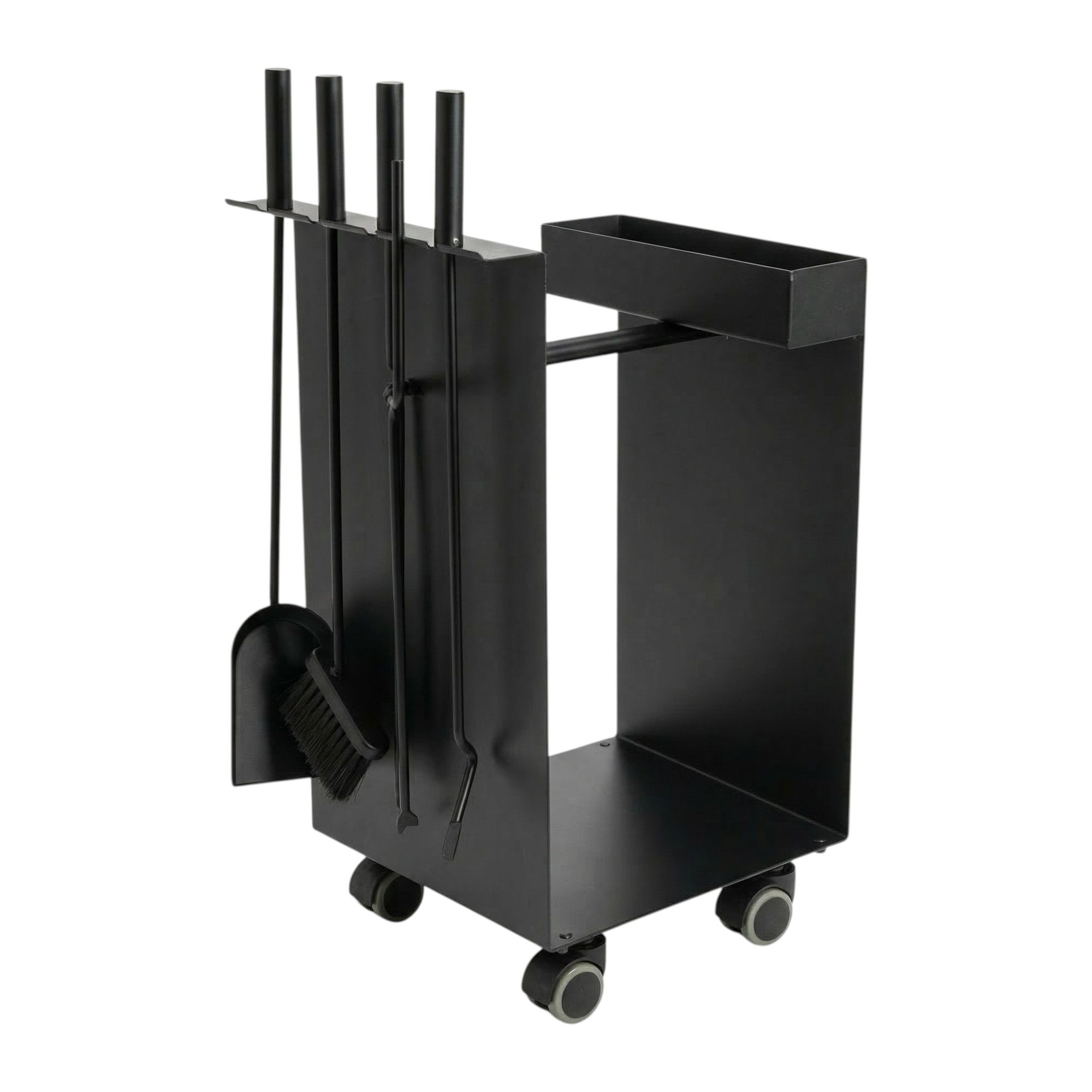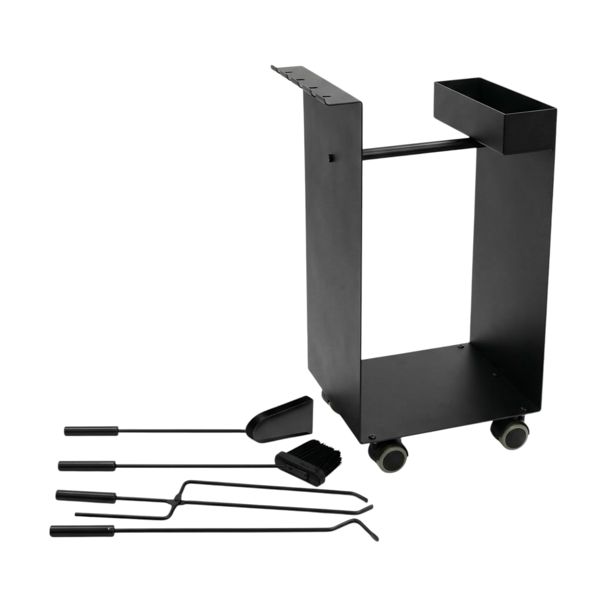 Wat deze uitvoering onderscheidt, is het handige karretje met wielen. Hierdoor verplaats je al je benodigdheden moeiteloos van de houtopslag naar je vuurkorf, buitenhaard of barbecue. Onderaan is er voldoende ruimte voor houtblokken, terwijl de zijkanten plaats bieden aan de vier meegeleverde tools. Daarnaast is er extra opbergruimte voor kleinere items zoals aanmaakblokjes of een aansteker, zodat je alles in één keer bij de hand hebt.