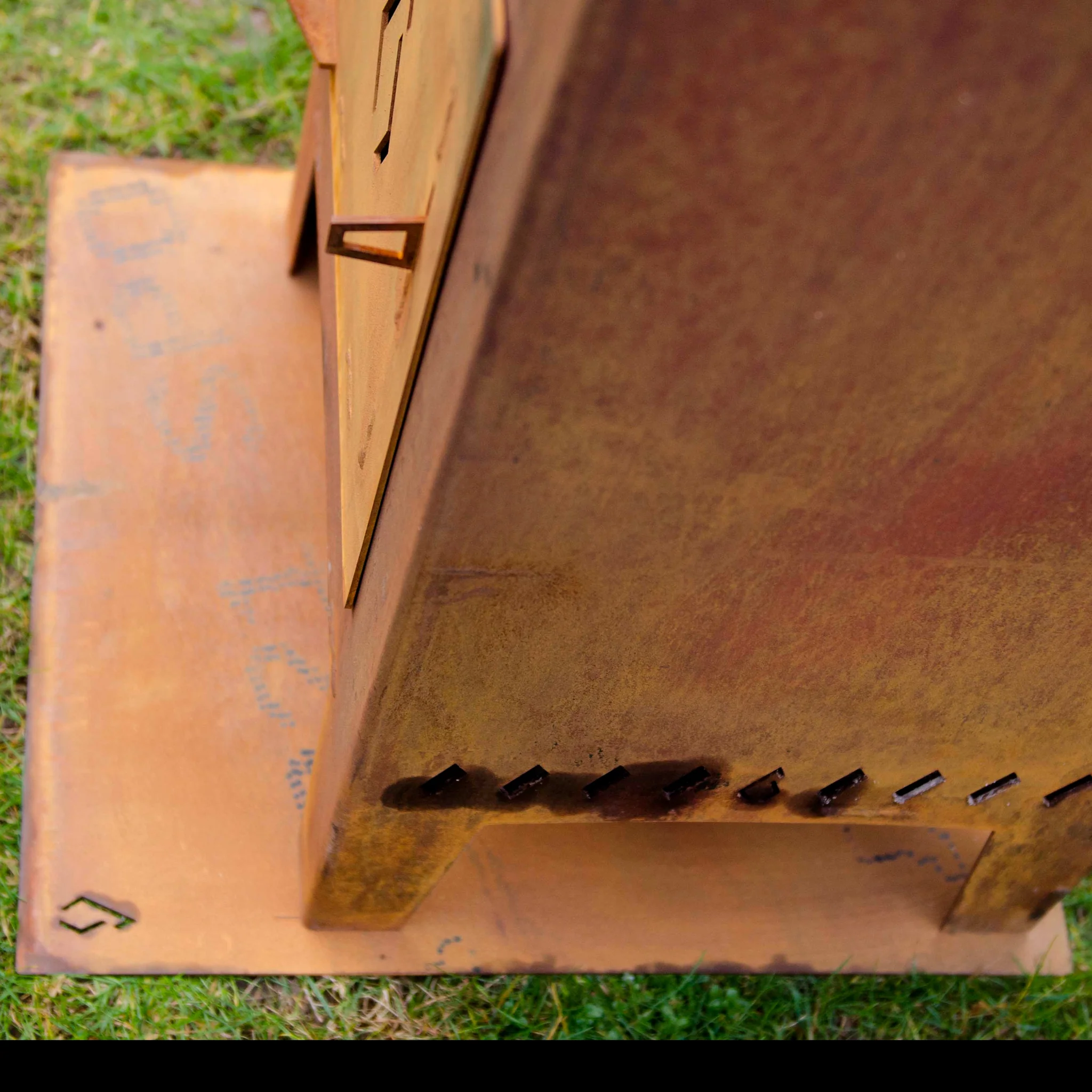 De vloerplaat is vervaardigd uit duurzaam Cortenstaal en heeft een afmeting van 55×50 cm.