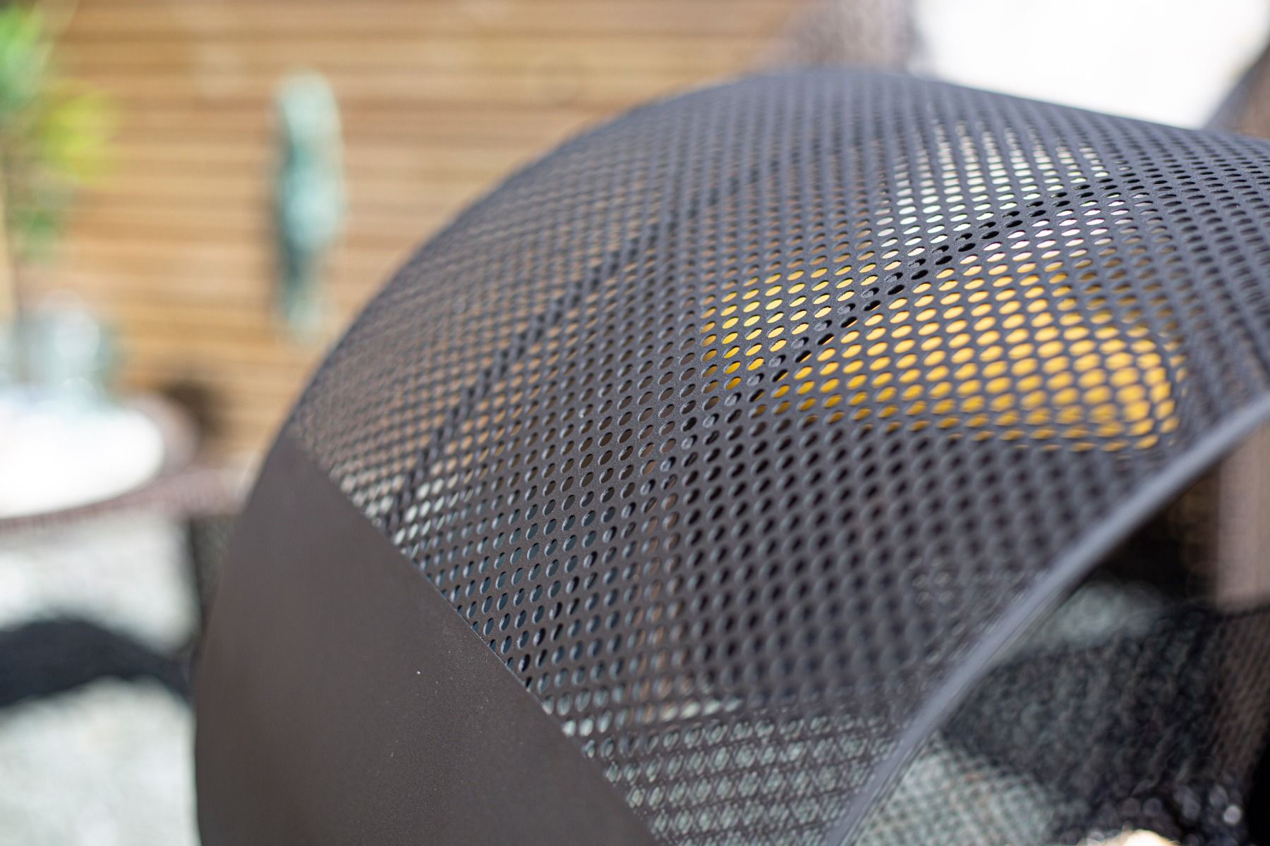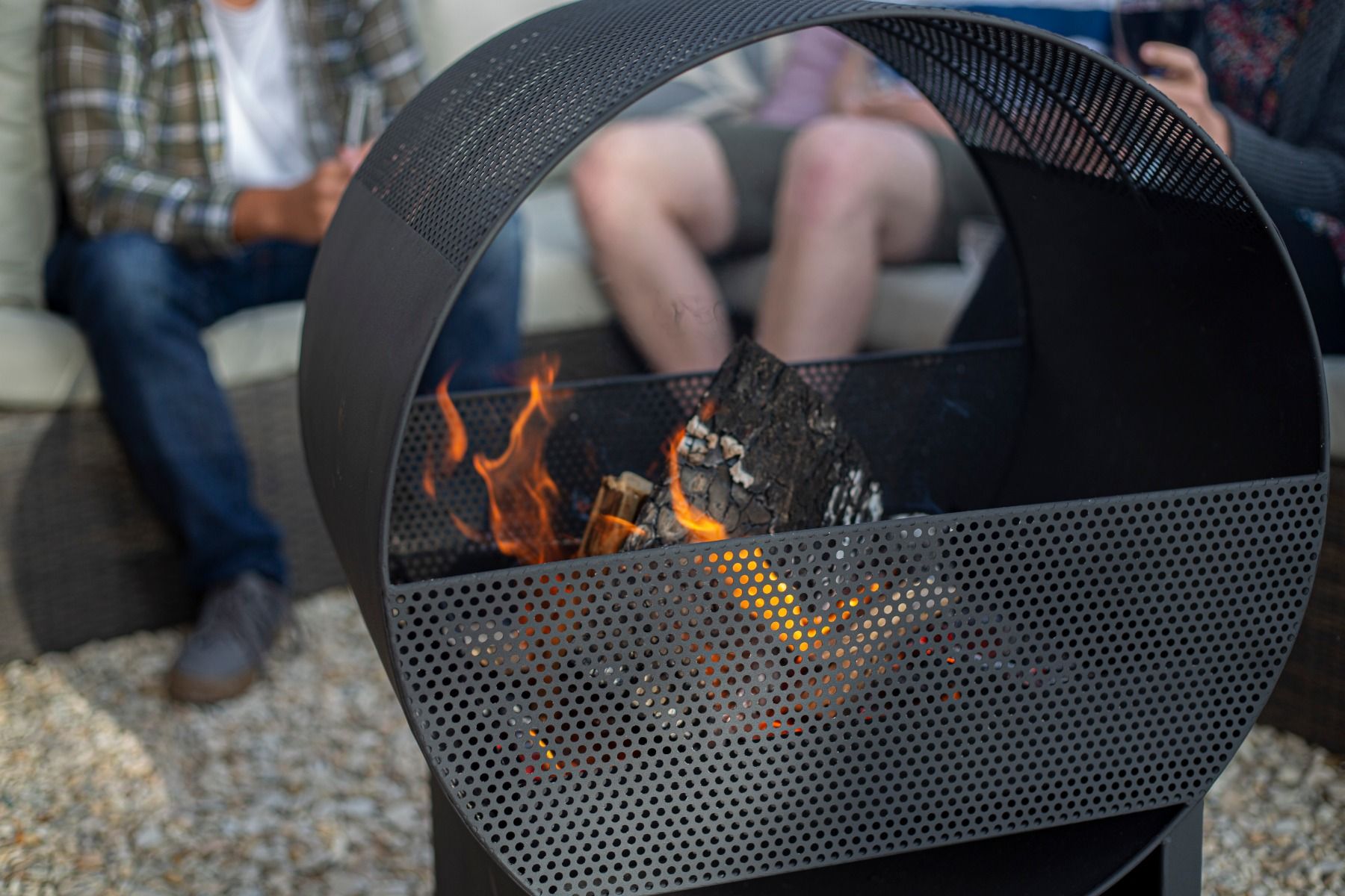 Deze buitenhaard is vervaardigd uit stevig staal en afgewerkt met een hittebestendige, zwarte coating. De geperforeerde stalen rand helpt om het brandhout netjes op zijn plek te houden en vermindert de kans op rondvliegende vonken, wat zorgt voor een veilige en comfortabele beleving.