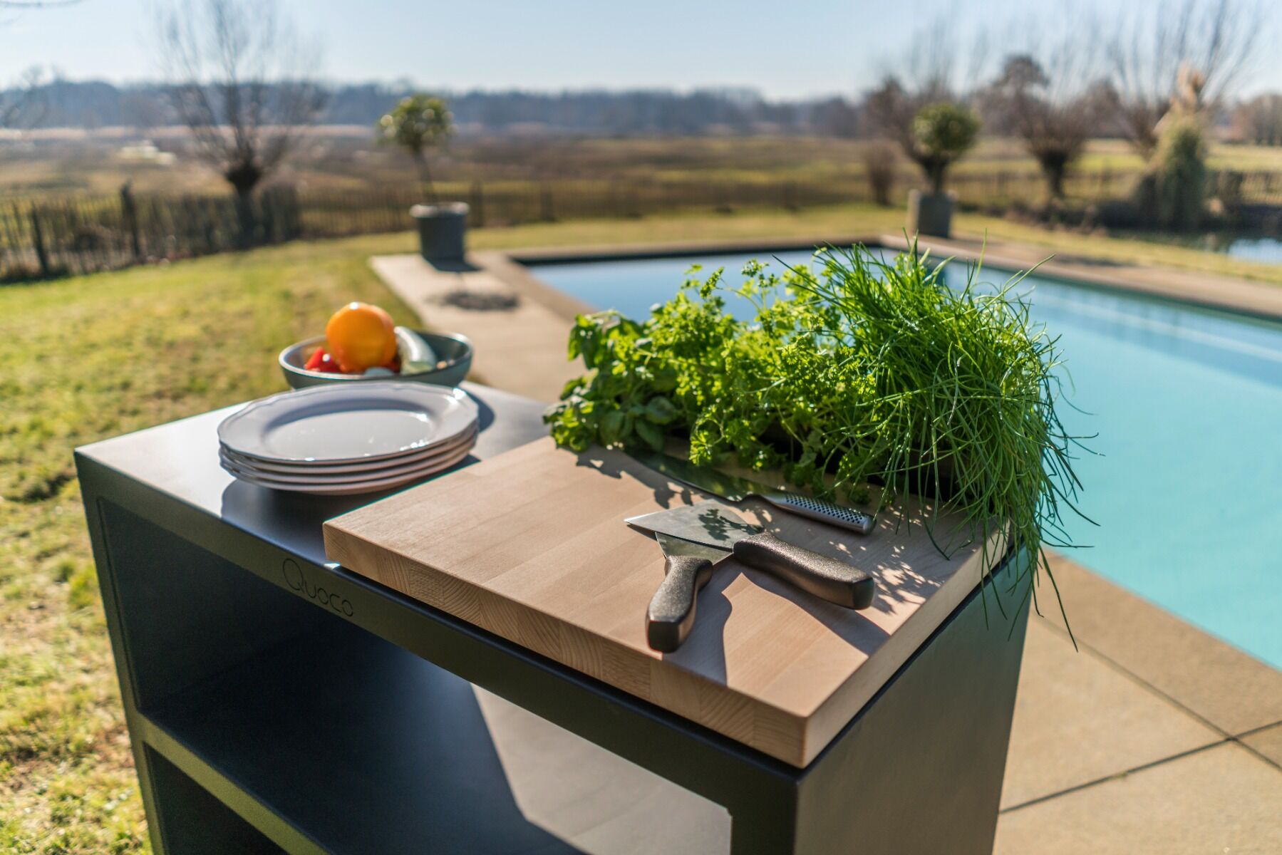 De Quoco TAVOLO is een praktische uitbreiding voor de buitenkeuken, uitgevoerd in stijlvol donkergrijs staal. Deze sokkel biedt extra opbergruimte voor keukengerei, hout of andere tuinspullen. Met een snijplank bovenop gebruik je de TAVOLO eenvoudig als extra werkblad of als verlengstuk van je bestaande kookunit.